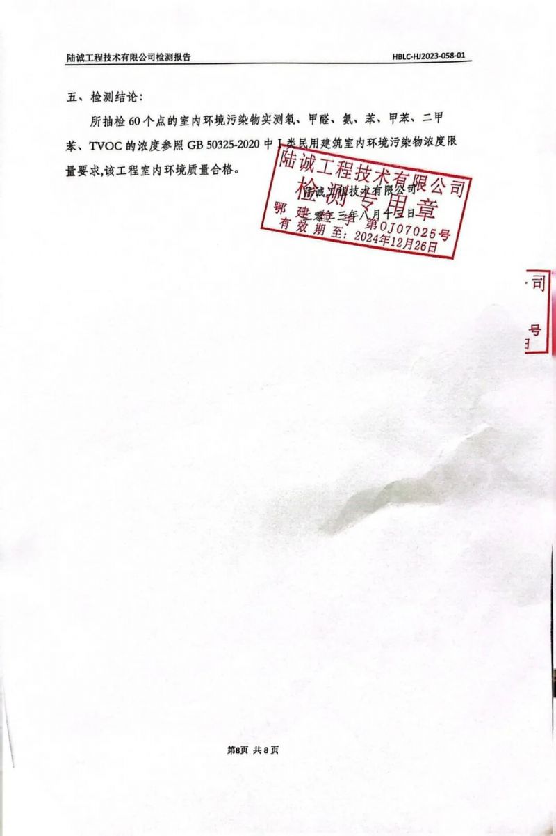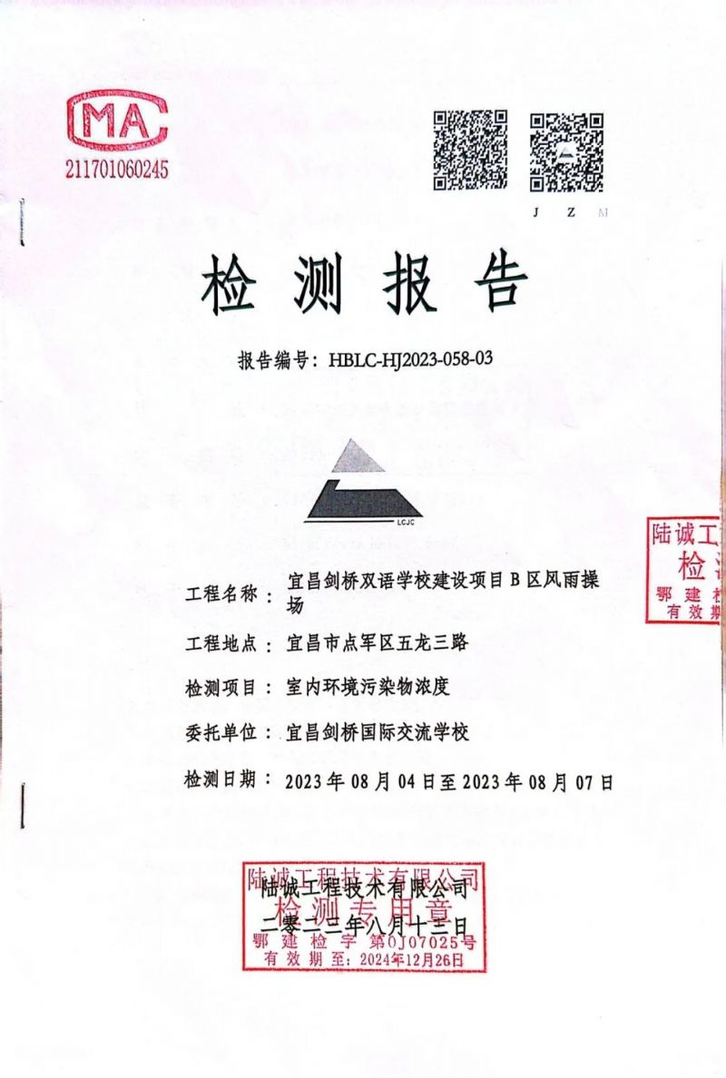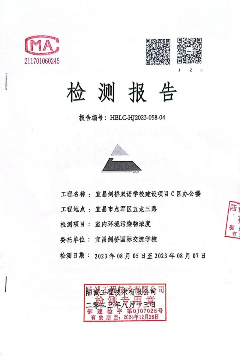 經(jīng)具有環(huán)境檢測(cè)資質(zhì)的陸誠(chéng)工程技術(shù)有限公司對(duì)宜昌歐陽(yáng)修學(xué)校(宜昌劍橋國(guó)際交流學(xué)校)新校建設(shè)工程進(jìn)行全面檢測(cè),學(xué)校A區(qū)學(xué)生宿舍1#樓、A區(qū)學(xué)生宿舍2#樓、B區(qū)風(fēng)雨操場(chǎng)、C區(qū)辦公樓、D區(qū)教學(xué)樓均已合格。