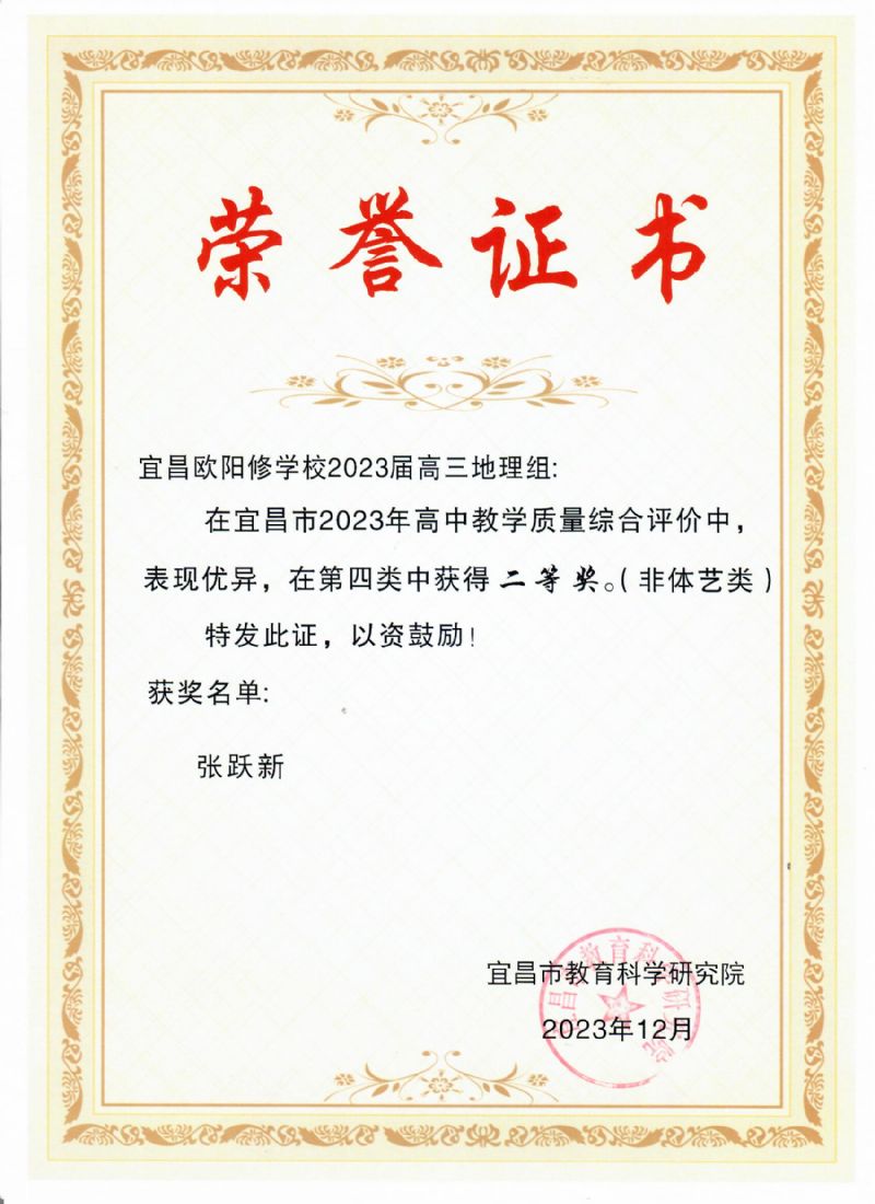 在宜昌市2023年高中教學(xué)質(zhì)量綜合評(píng)價(jià)中,我校高三地理教研組表現(xiàn)優(yōu)異,榮獲同類學(xué)校二等獎(jiǎng)。