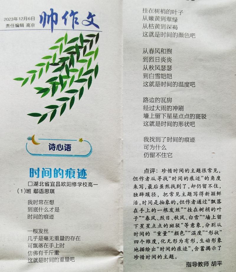 (該詩作和點(diǎn)評(píng)已在2023年12月6日的《帥作文》高中版發(fā)表,該報(bào)由人民文學(xué)出版社和湖北日?qǐng)?bào)傳媒集團(tuán)聯(lián)合主辦)