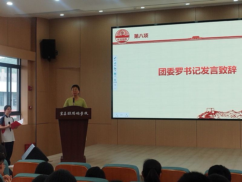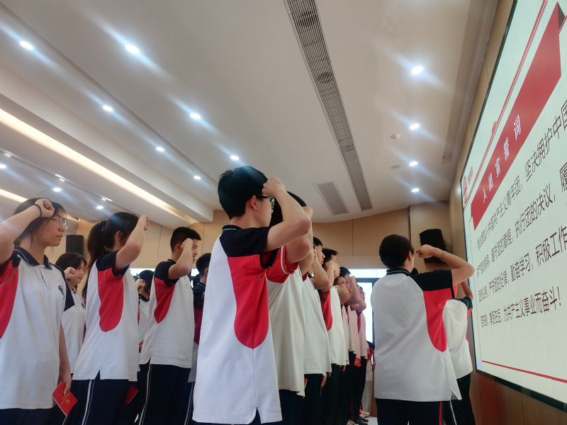 此次活動由202班張子博同學(xué)和203班李曉薇同學(xué)主持,德育副校長向麗華同志,團委書記羅琰淼同志,團委副書記馮楨同志,142名老團員及43名新團員參加了此次活動?;顒恿鞒倘缦拢?/p>