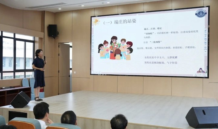 教師的職業(yè)形象直接影響到學(xué)生和家長(zhǎng)對(duì)學(xué)校的整體印象。最后,學(xué)校領(lǐng)導(dǎo)對(duì)全體教師進(jìn)行禮儀培訓(xùn),黃校長(zhǎng)淡雅從容,娓娓道來,本身即是教師禮儀一章的最好注解。她結(jié)合實(shí)例,談到了教師禮儀的方方面面。“禮潤(rùn)師德,儀以修身”,教師是鏡子,學(xué)生是教師的影子,優(yōu)秀教師的12種素質(zhì)令人印象深刻,老師們獲益良多!