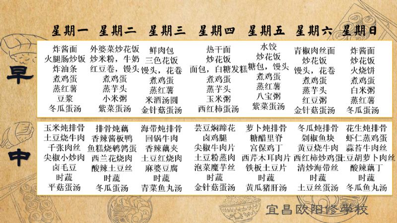 宜昌歐陽修學校每周食譜(3月10日至3月16日)