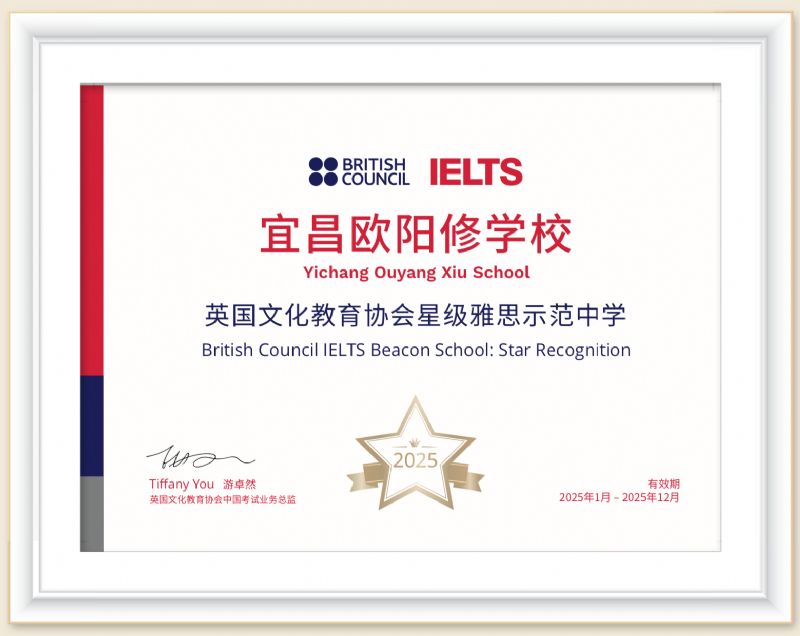 宜昌歐陽修學?,F(xiàn)設有普通高中和國際高中。20多年來,學校先后獲得“宜昌市區(qū)域現(xiàn)代化先進學?!?、“宜昌市優(yōu)秀民辦學校”等諸多榮譽稱號,是宜昌市唯一被英國文化教育協(xié)會BritishCouncil授牌的“星級雅思示范中學”、“雅思教師培訓基地”和“Aptis普思考點示范學?!薄ⅰ叭龒{大學外國語學院學科教學英語研究生工作站”。2023年7月,中國工程院院士,香港中文大學(深圳)校長徐楊生先生為宜昌歐陽修學校題寫校名。